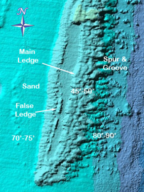 Navigation: Start out in either the north or south hook (depending on the current) and drift along the main ledge. This is the best scenic route. If you are lobstering sometimes it pays to venture to the deep side of the reef (east) to the Spur & Groove or to the false ledge to the west