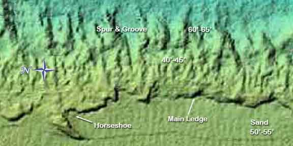 Description: Horseshoe is shallow than most of the outer reefs in the Boynton area. The top of the reef is 40 - 45 ft and the sand on the western side 50-55 ft. The main ledge meanders in and out and is not as much a straight line and at the north end it hooks and actually heads back south. Along with all the usual marine life found in Florida, schools of spade fish are common here.