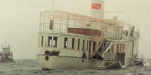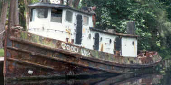 Navigation: Depending on the current you either start out on the Ancient Mariner or the Quallman Barge. Circumnavigate each wreck, then take a heading and follow the stakes to each wreck. If you leave from the Quallman Brage follow the stakes (240 degrees) to the reef edge. Then follow the reef edge until you either see a stake or the Berry Patch Tug on your left. The distance between the Ancient Mariner and the Berry Patch Tug is approximately 150' and the Tug to the Barge is approximately 600'. Be careful not to get your flag tangled on the wreck. Sometimes it easier if you are going to stay on the wreck for awhile to tie it off and then retrieve it when you're ready to move on.